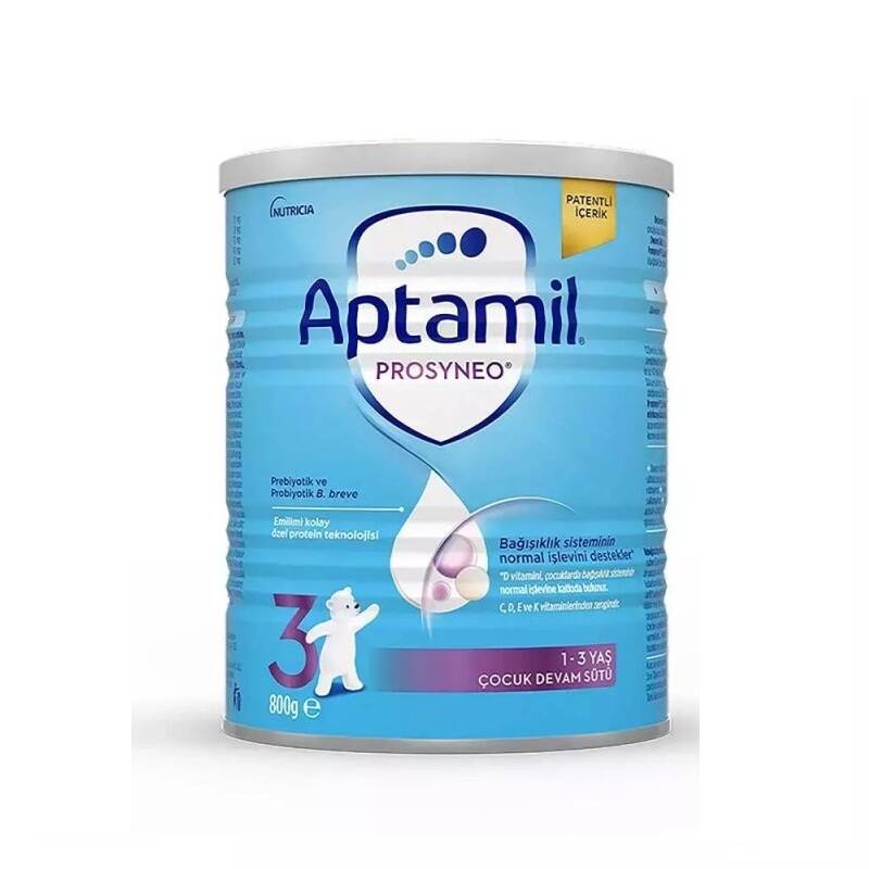 Aptamil Prosyneo 3 Çocuk Devam Sütü prebiyotik lifler ve probiyotik içerir. Doktorunuza danışarak anne sütünün hiç verilemediği veya yetersiz olduğu durumlarda kullanılır. Doktorunuz farklı bir öneride bulunmadığı sürece 1 yaşından sonra Aptamil Prosyneo 3 Çocuk Devam Sütünü kullanabilirsiniz. C, D, B2, B5, B12 ve K vitaminlerinden zengindir. Demir, Çinko ve Kalsiyum mineralleri kaynağıdır.