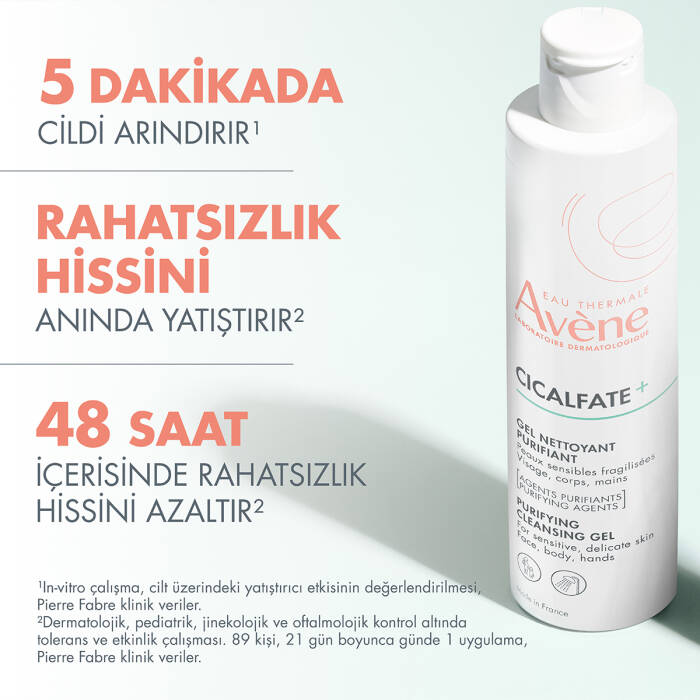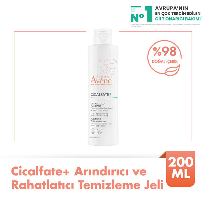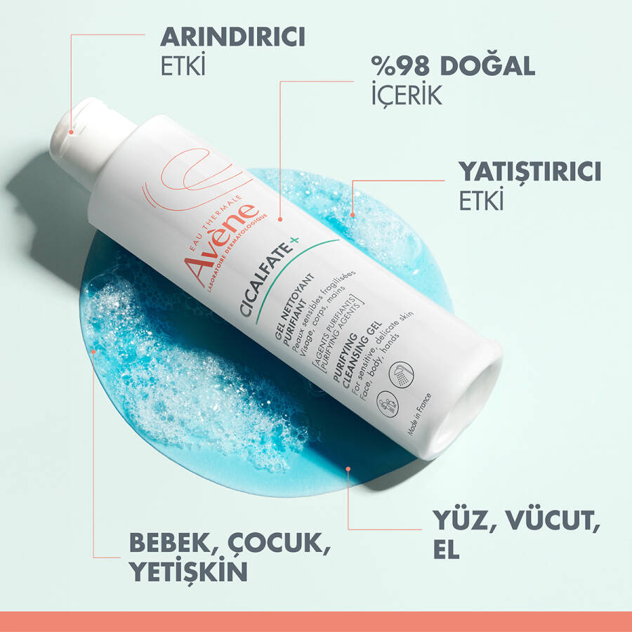Cicalfate+ Arındırıcı ve Rahatlatıcı Temizleme Jeli, içeriğindeki Avène Termal Su, C+ Restore, bakır-çinko sülfat, gliserin ile hassas cilt temizliği sunarken %98 doğal içeriği ile bebek, çocuk, yetişkin tüm ailenin hassas cildini kurutmadan temizler ve arındırır. Rahatsızlık hissini anında rahatlatır.*