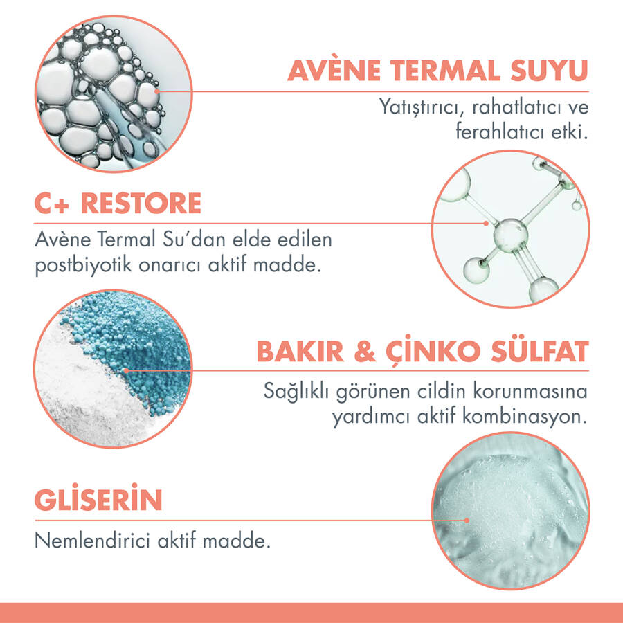 C+ Restore; Avène termal suyundan elde edilen patentli postbiyotik aktif bileşen. Cilt onarımını destekler.