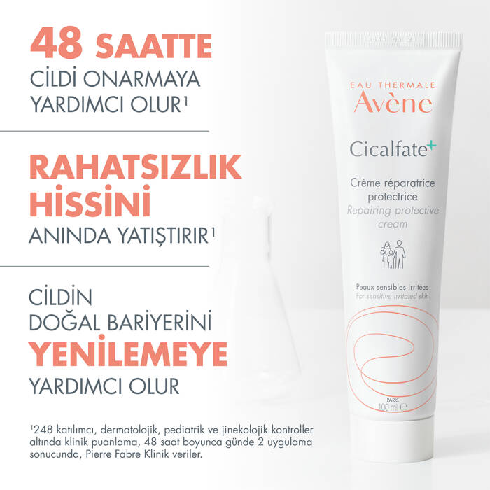 Cicalfate+ Yıpranmış Hassas Ciltlerin Yatışmasına ve Onarılmasına Yardımcı Bakım Kremi, içeriğindeki Avène Termal Su, C+ Restore, Bakır-Çinko Sülfat sayesinde cildi onarır ve yatıştırır.