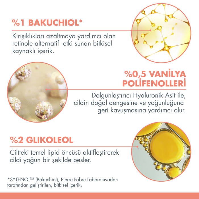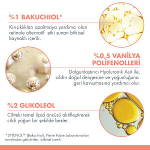 Detaylı Ürün İçeriği% 1 Bakuchiol*, % 0,5 Vanilya Polifenolleri, % 2 Glikoleol.