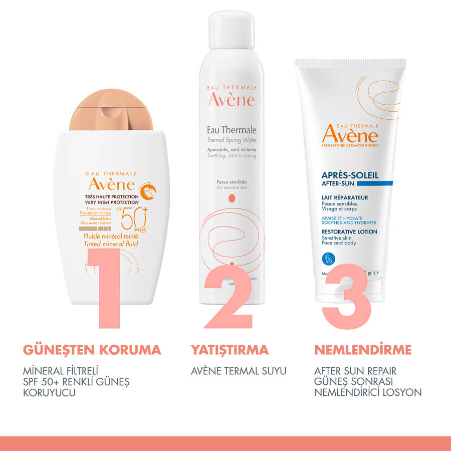 Renkli dokulu güneş koruyucu krem özelliği ile cilt tonunu eşitleyici bir koruma sağlar. Ultra hafif dokusu ile cilt tarafından hızla emilir. Cilt üzerinde beyaz film tabakası bırakmaz. Avène Termal Su ile yatıştırıcı ve rahatlatıcı etki sunar.