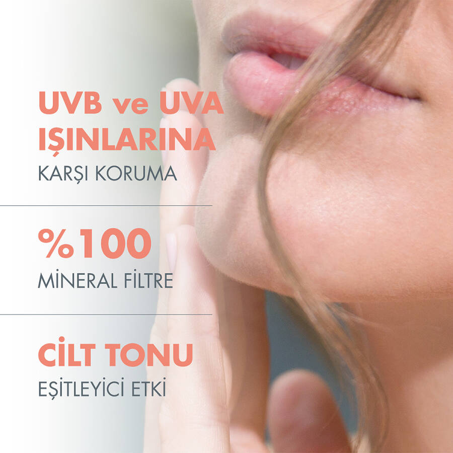 Mineral Filtreli SPF 50+ Renkli Güneş Koruyucu, güneş ışınlarının zararlı etkilerine karşı savaşan fotostabil UVB / UVA filtreleri içerir ve hafif akışkan dokusuyla hassas ve/veya toleranssız ciltleri nemlendirir.