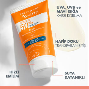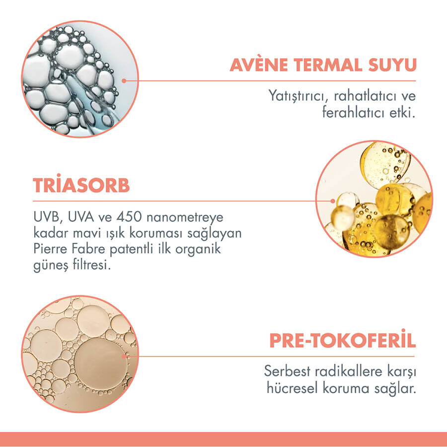 Akışkan ve ultra hafif yapısı sayesinde cilt tarafından hızla emilir. Cilt tonu eşitleyici bir etki arayanlar için renkli doku seçeneği mevcuttur. Normal, hassas ve karma ciltler için güneş koruyucu özelliğinin yanı sıra mat bir bitiş sunar. Formülündeki Avène Termal Su cildi yatıştırır ve rahatlatır.
