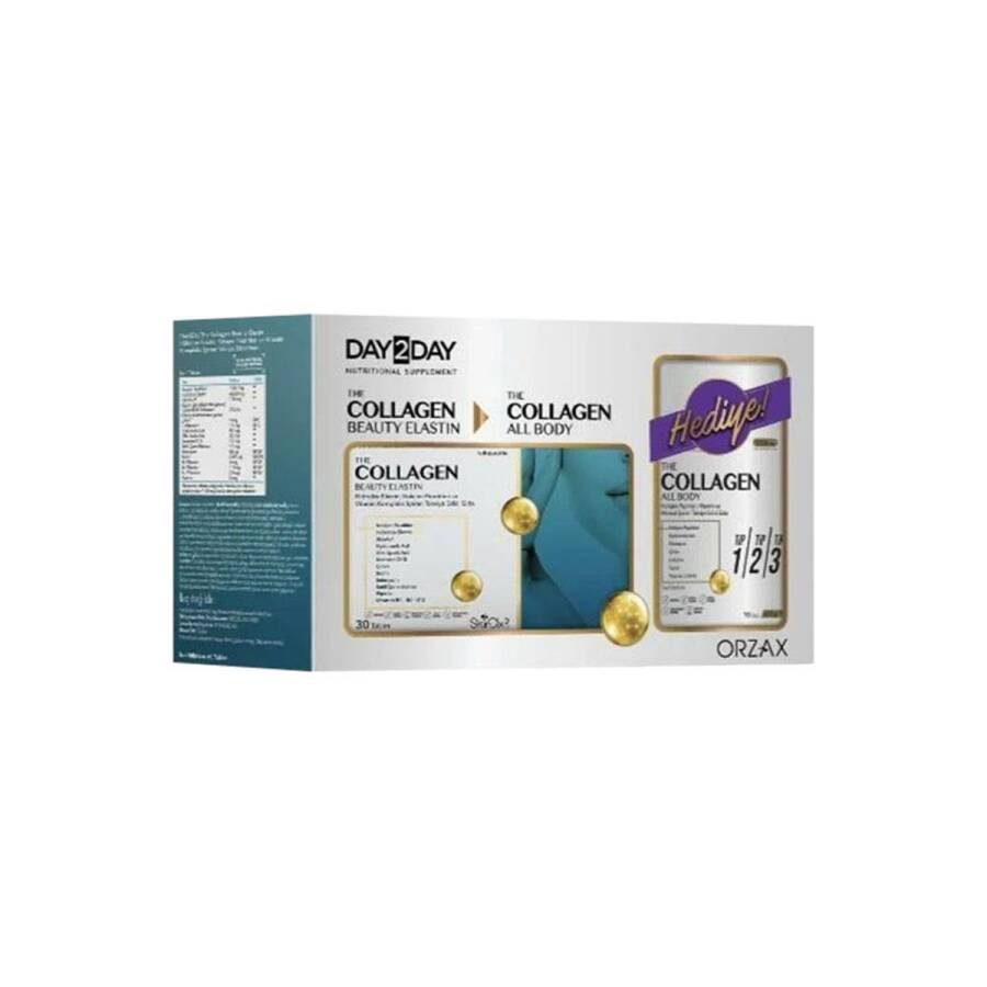 Detaylı Ürün İçeriğiDay2Day The Collagen Beauty Elastin 30 Tablet; Her 2 Tablette; Hidrolize Peptitleri¹ 1000 mg, Hidrolize Elastin¹ 63,83 mg, SkinAx² 150 mg, Polifenol (üzüm çekirdeğinden gelen) 105 mg, Süperoksit Dismutaz (kavun ekstresinden gelen) 331,5 UI, Çinko 4 mg, C Vitamini 12 mg, Hyaluronik Asit 50 mg, Alfa-Lipoik Asit 20 mg, Koenzim Q10 10 mg,Sahil Çamı Ekstresi 10 mg, Selenyum 55 µg, Biotin 2500 µg, B5 Vitamini 6 mg, B6 Vitamini 1,4 mg, B12 Vitamini 2,5 µg, Piperin 5 mg.Day2Day The Collagen All Body 100 gr;Her 1 ölçekte (10 g); Tip 1 Kolajen Peptitleri 7440 mg, Tip 2 Kolajen Peptitleri 36,6 mg, Tip 3 Kolajen Peptitleri 1860 mg, Hyaluronik Asit 100 mg,C Vitamini 250 mg, D3 Vitamini 25 µg, K2 Vitamini 12 µg, Taurin 10 mg, L-Arjinin 100 mg, Glutatyon 30 mg, Çinko 10 mg.
