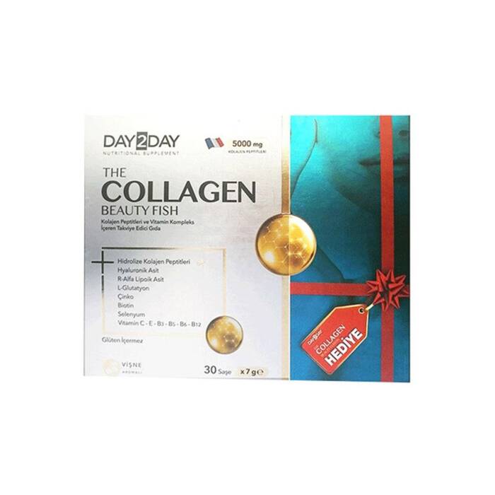 Detaylı Ürün İçeriğiDay2Day The Collagen Beauty Fish Kollajen 30 Saşe; Her 1 Saşede; Kolajen Peptit 5000 mg, C Vitamini 250 mg, Hyaluronik Asit 100 mg, Alfa Lipoik Asit 50 mg, Glutatyon 30 mg, B3 Vitamini 16 mg NE, Çinko 10 mg, E Vitamini 6 mg a-TE, B5 Vitamini 6 mg, B6 Vitamini 1,4 mg, Biotin 2500 µg, Selenyum 55 µg, B12 Vitamini 2,5 µg. Day2Day The Collagen Beauty Elastin 500 mg 60 Tablet; Her 2 Tablette; Hidrolize Kolajen Peptitleri¹ 1000 mg, Hidrolize Elastin¹ 63,83 mg, SkinAx² 150 mg, Polifenol (üzüm çekirdeğinden gelen) 105 mg, Süperoksit Dismutaz (kavun ekstresinden gelen) 31,5 UI, Çinko 4 mg, C Vitamini 12 mg, Hyaluronik Asit 50 mg, Alfa-Lipoik Asit 20 mg, Koenzim Q10 10 mg, Sahil Çamı Ekstresi 10 mg, Selenyum 55 µg, Biotin 2500 µg, B5 Vitamini 6 mg, B6 Vitamini 1,4 mg, B12 Vitamini 2,5 µg, Piperin 5 mg.