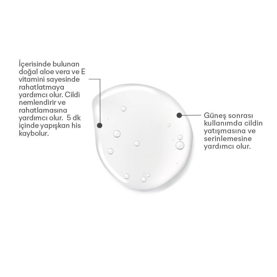 Aloe Vera saf özü ile formüle edilmiş, vitamin E ile zenginleştirilmiş içeriğiyle, kuru cilt üzerinde nemlendirici ve besleyici özelliğe sahiptir. Güneşten kaynaklı cilt görünümünü düzeltmeye yardımcı olur.. Yağsız formülüyle bütün cilt tiplerine uygun olup cilt tarafından emilmektedir. Komedojenik, parfüm ve boyar madde içermez.