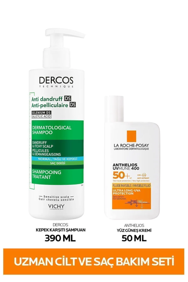 Detaylı Ürün İçeriğiDercos Kepek Karşıtı Şampuan 390 ml: AQUA / WATER - SODIUM LAURETH SULFATE - GLYCOL DISTEARATE - COCO-BETAINE - GLYCERIN - DIMETHICONE - CARBOMER - CI 19140 / YELLOW 5 - CITRIC ACID - MENTHOL - 2-OLEAMIDO-1,3-OCTADECANEDIOL - PPG-5-CETETH-20 - SALICYLIC ACID - SELENIUM SULFIDE - SODIUM BENZOATE - SODIUM CHLORIDE - SODIUM HYDROXIDE - TOCOPHERYL ACETATE - PARFUM / FRAGRANCE. Anthelios Yüz Güneş Kremi 50 ml: AQUA/WATER/EAU, ALCOHOL DENAT., TRIETHYL CITRATE, DIISOPROPYL SEBACATE, SILICA, BIS-ETHYLHEXYLOXYPHENOL METHOXYPHENYL TRIAZINE, ETHYLHEXYL SALICYLATE, ETHYLHEXYL TRIAZONE, BUTYL METHOXYDIBENZOYLMETHANE, GLYCERIN, PROPANEDIOL, C12-22 ALKYL ACRYLATE/HYDROXYETHYLACRYLATE COPOLYMER, C12-15 ALKYL BENZOATE, SODIUM CITRATE, METHOXYPROPYLAMINO CYCLOHEXENYLIDENE ETHOXYETHYLCYANOACETATE, PERLITE, TOCOPHEROL, CAPRYLIC/CAPRIC TRIGLYCERIDE, ACRYLATES/C10-30 ALKYL ACRYLATE CROSSPOLYMER, BIXA ORELLANA SEED EXTRACT, CAPRYLYL GLYCOL, CITRIC ACID, DIETHYLAMINO HYDROXYBENZOYL HEXYL BENZOATE, DROMETRIZOLE TRISILOXANE, HYDROXYACETOPHENONE, HYDROXYETHYLCELLULOSE, MALTODEXTRIN, PENTYLENE GLYCOL, SILICA SILYLATE, TEREPHTHALYLIDENE DICAMPHOR SULFONIC ACID, TRIETHANOLAMINE, TRISODIUM ETHYLENEDIAMINE DISUCCINATE, ZINC PCA, PARFUM/FRAGRANCE.