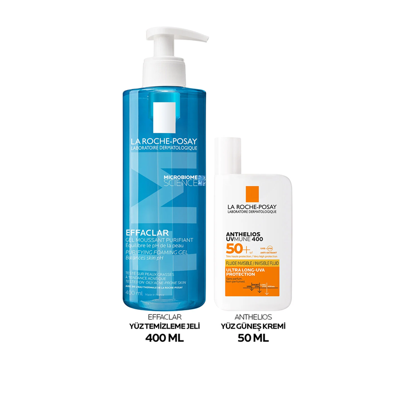 La Roche Posay Effaclar Gel 400 ml: Yağlı ve Akneye Eğilim Gösteren Cilt Tipleri İçin. La Roche Posay Anthelios Uvmune 400 Oil Control Fluid Yüz Güneş Kremi SPF50+ 50 ml: Hassas, Yağlı ve Güneş Hassasiyeti Olan Cilt Tipleri İçin.
