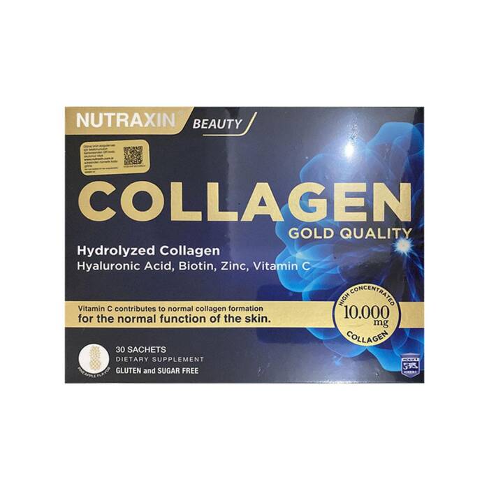 NUTRAXIN Collagen, güzellik kavramında önem taşıyan hyalüronik asit, çinko, biotin, selenyum ve diğer mikro besinleri bir arada sunar. İçeriğinde yer alan kolajen, kolay emilim sağlayan hidrolize kolajendir. Ananas aroması ile içimi lezzetlidir.