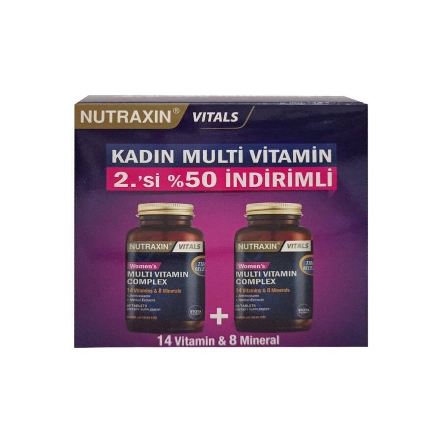 Detaylı Ürün İçeriğiHer 2 Tablette; Vitamin A (Beta-karoten) 1000 IU (0,68 mg), Vitamin B1 (Tiamin mononitrat) 1,3 mg, Vitamin B2 (Riboflavin ) 1,2 mg, Vitamin B3 (Niyasinamid) 20 mg, Vitamin B5 (Pantotenik asit) 9 mg, Vitamin B6 (Pridoksin) 10 mg, Vitamin B7 (D-biotin ) 120 mcg, Vitamin B9 (Folik Asit) 400 mcg, Vitamin B12 (Siyanokobalamin) 22 mcg, Kolin (Kolin bitartarat) 13,5 mg, Inositol 33 mg, Vitamin C (L-askorbik asit) 60 mg, Vitamin D3 400 IU (10 mcg), Vitamin E (α-TE) 10 IU (10 mg), Bakır (sülfat) 400 mcg, Çinko (sülfat) 4 mg, Demir (Bisglisinat) 11 mg, Kalsiyum (Karbonat) 500 mg, Krom (pikolinat) 30 mcg, Manganez (sülfat) 720 mcg, Molibden (Sodyum molibdat) 18 mcg, Selenyum (L-Selenometiyonin) 136 mcg, Alfa Lipoik Asit 5 mg, Resveratrol 2,5 mg, Yaban Mersini (Vaccinum myrtillus) Ekstresi 2 mg, Yeşilçay (Camellia sinensis) Ekstresi 2 mg, Domates (Solanum lycopersicum) Ekstresi 2 mg, Hayıt (Vitex Agnus) Ekstresi 40 mg, Kore Ginsengi (Panax ginseng) Ekstresi 20 mg, At Kuyruğu ( Equisetum arvense) Ekstresi 5 mg.