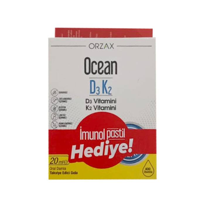 Detaylı Ürün İçeriğiOrzax Ocean D3 K2 Damla 20 ml ( Her damlada ); D3 Vitamini 25 µg (1000 IU), K2 Vitamini 11,25 µg.