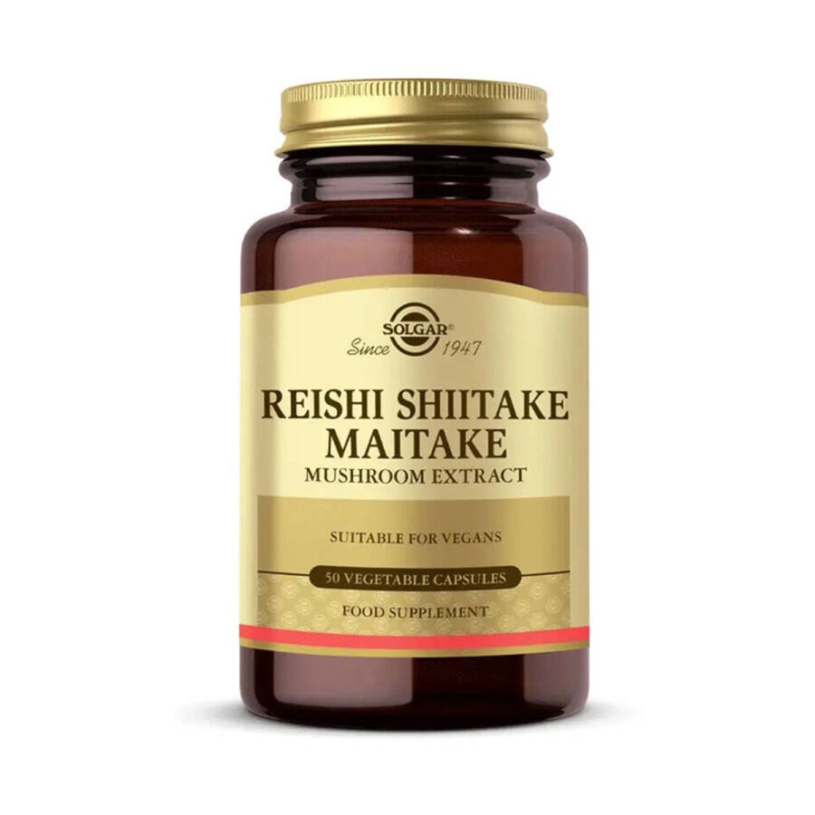 Reishi, Shiitake ve Maitake mantarlarının ekstresini içeren besin takviyesi.