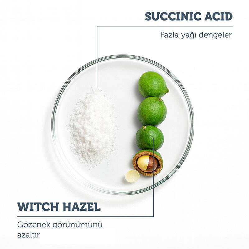 Süksinik Asit: Fazla yağı dengeler ve cildin parlamasını önler.