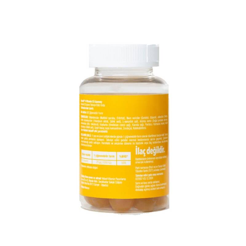 1000 IU D Vitamini içerir. D Vitamini, bağışıklık sisteminin normal fonksiyonuna katkıda bulunur. D Vitamini, kemiklerin korunmasına, kalsiyum ve fosforun normal emilimine / kullanımına katkıda bulunur. Doğal portakal aroması ile kullanımı kolaydır. Glüten, soya, laktoz içermez. Çiğnenebilir form pektin ile elde edilmistir.
