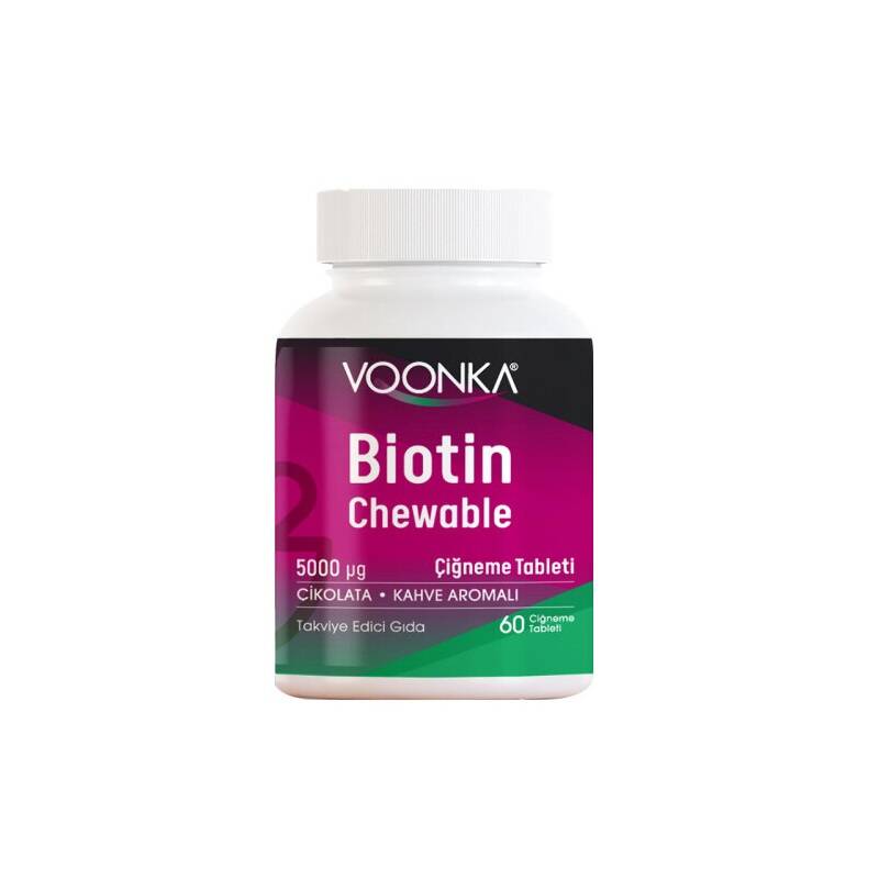 Vücudun biyotin ihtiyacını karşılamak amacıyla üretilen Voonka Biotin; her tablette 5000 mcg biyotin, diğer adıyla B7 vitamini takviyesi sunan bir gıda takviyesidir.