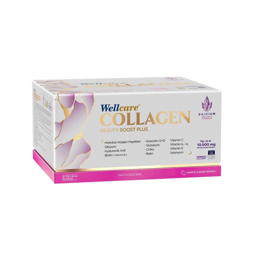 Detaylı Ürün İçeriğiHer 1 Kapsül; Silisyum 5 mg. Her 1 Tüp (40 ml); Hidrolize kollajen peptitleri (Tip 1 ve Tip 3) 10000 mg, Vitamin C (L-askorbik asit) 300 mg, Hyaluronik asit 100 mg, Glutatyon 10 mg, Çinko 10 mg, Koenzim Q10 10 mg, Vitamin B5 (Pantotenik asit) 6 mg, Vitamin E 3 mg α-TE, Biotin (Vitamin B7) 2500 µg, Vitamin B6 (Piridoksin) 1,4 mg, Bakır 300 µg, Selenyum 27,5 µg.